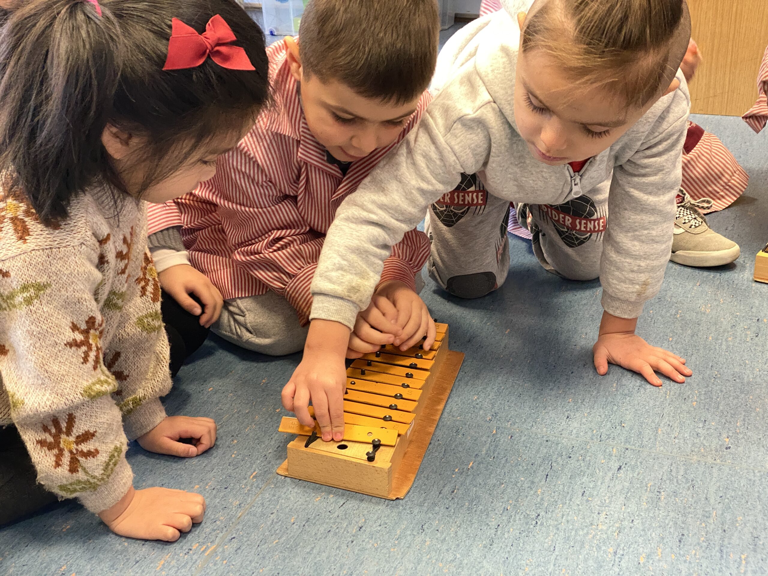 Els nens i nenes d’Infantil desenvolupen el seu sentit rítmic utilitzant tot tipus d’intruments de percussió. Això també els ajuda a discriminar els diferents sons d’aquesta família d’instruments i a entendre la importància del silenci.